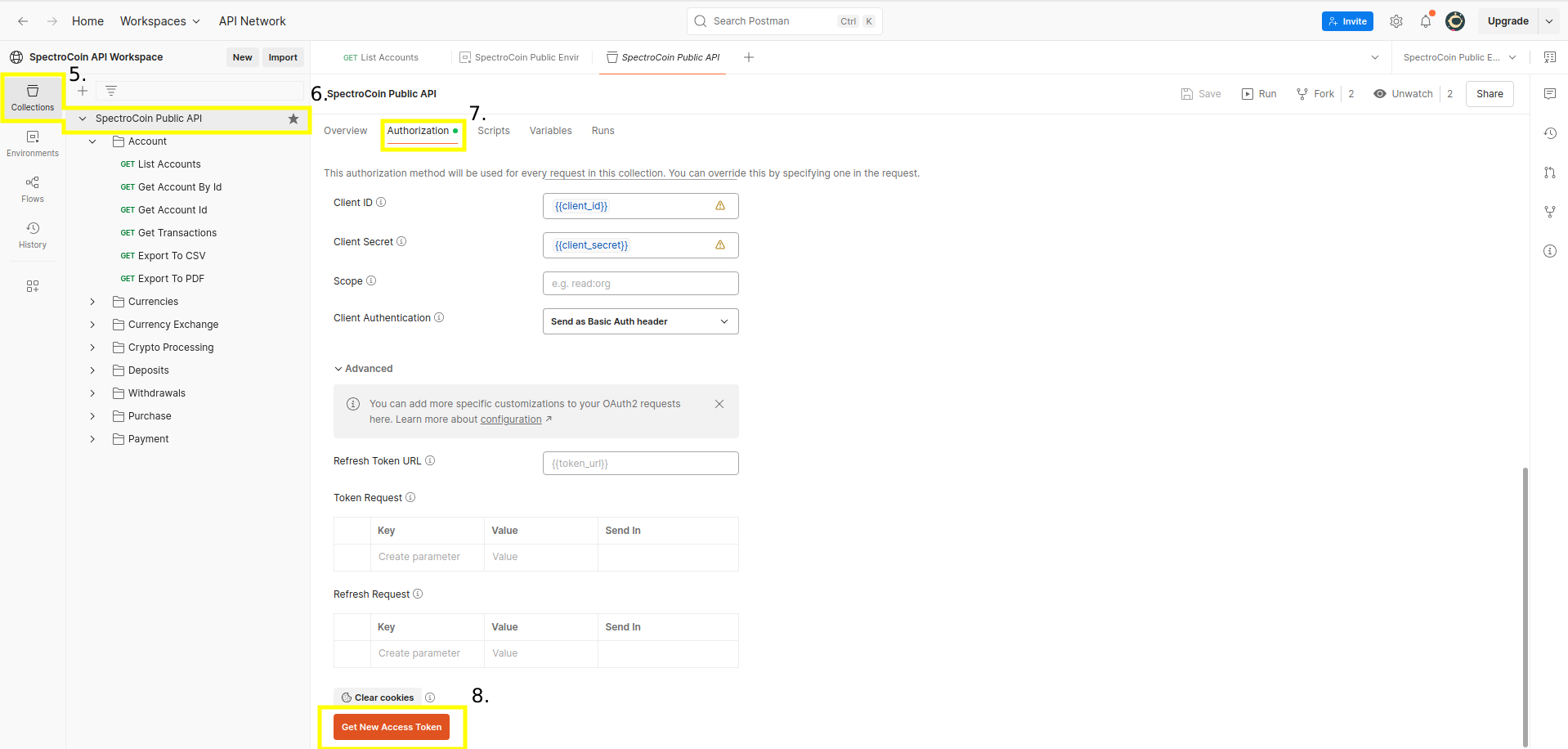 In this step you will get the idea if the populated credentials are correct. Navigate back to Collections (5.), select forked collection SpectroCoin Public API (6.), click on Authorization (7.) and lastly - Get New Access Token (8.). If you see success message, that's great, now proceed using newly generated token.
