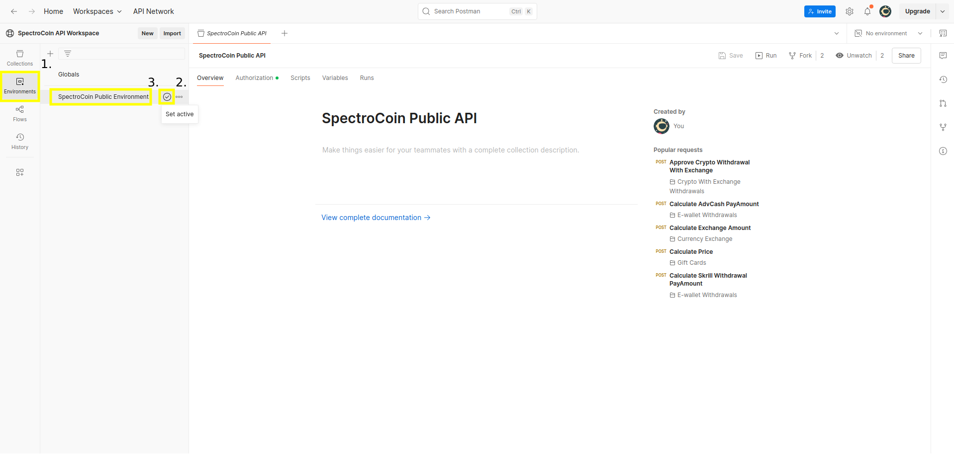When Postman web or desktop app loads the workspace, click on the Environments (1.). Then set the forked environment to active by clicking the check icon (2.). Next, proceed, by clicking on the SpectroCoin Public Environment (3.).