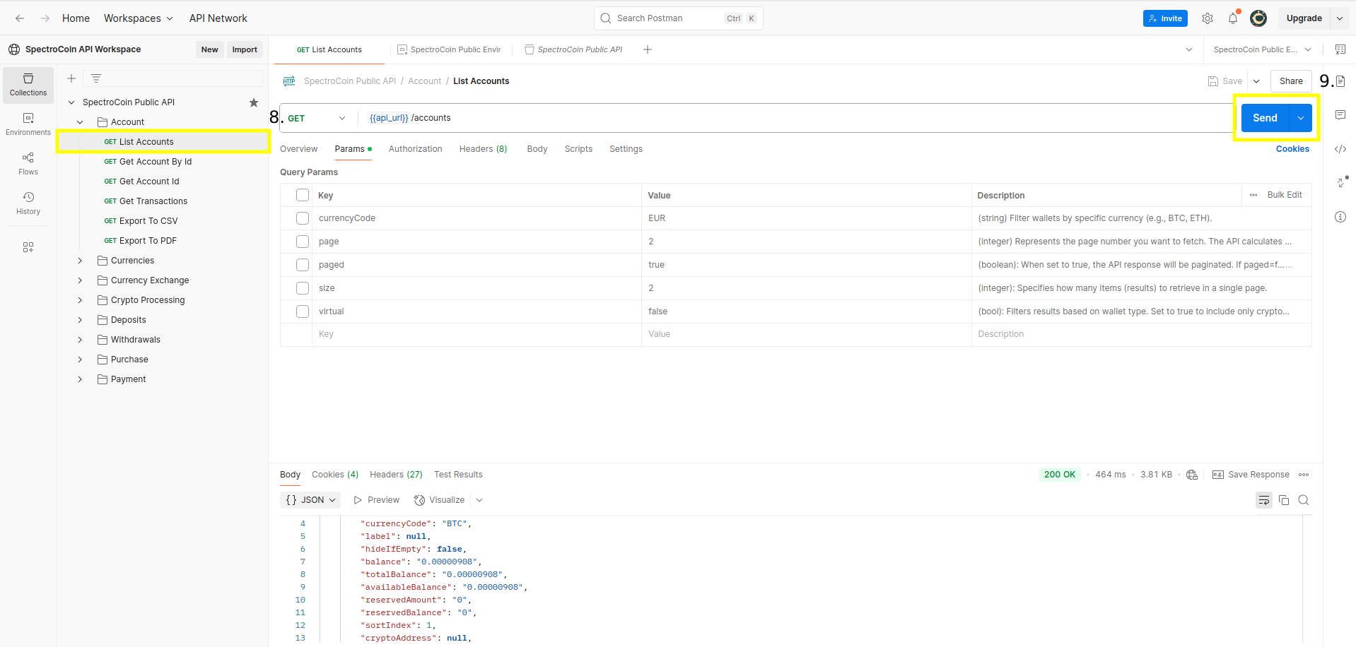 For the final verification step, pick any request that doesn’t require mandatory parameters—here, GET List Accounts (8.)—and click Send (9.). A 200 OK status with the response body (as shown) means the forked collection is working correctly. If you see any other status code, please refer to our Status codes guide .