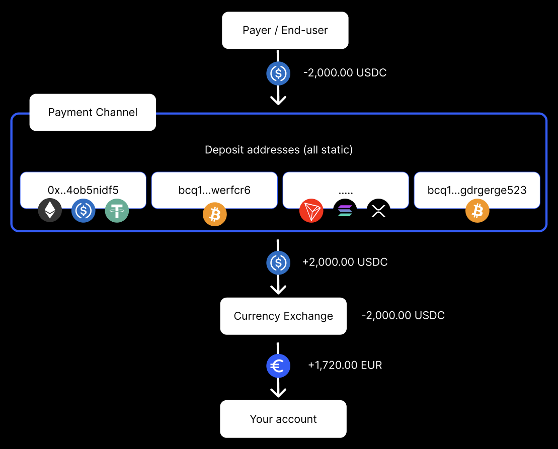 The channels are configured so that crypto deposits received to channel-linked addresses are automatically exchanged into a settlement currency (e.g., EUR), subject to the availability of the required exchange pair and other operational constraints.